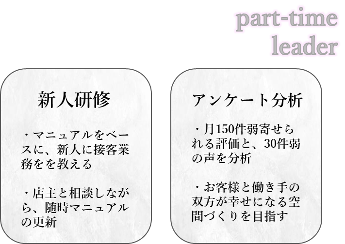 大学2年次からは、店主と他バイトリーダー3人からの推薦により、学生バイトリーダーを任され、